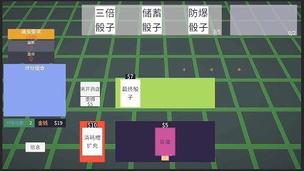 每次通过一关后,会进入商店购买道具对牌型,骰子进行强化。