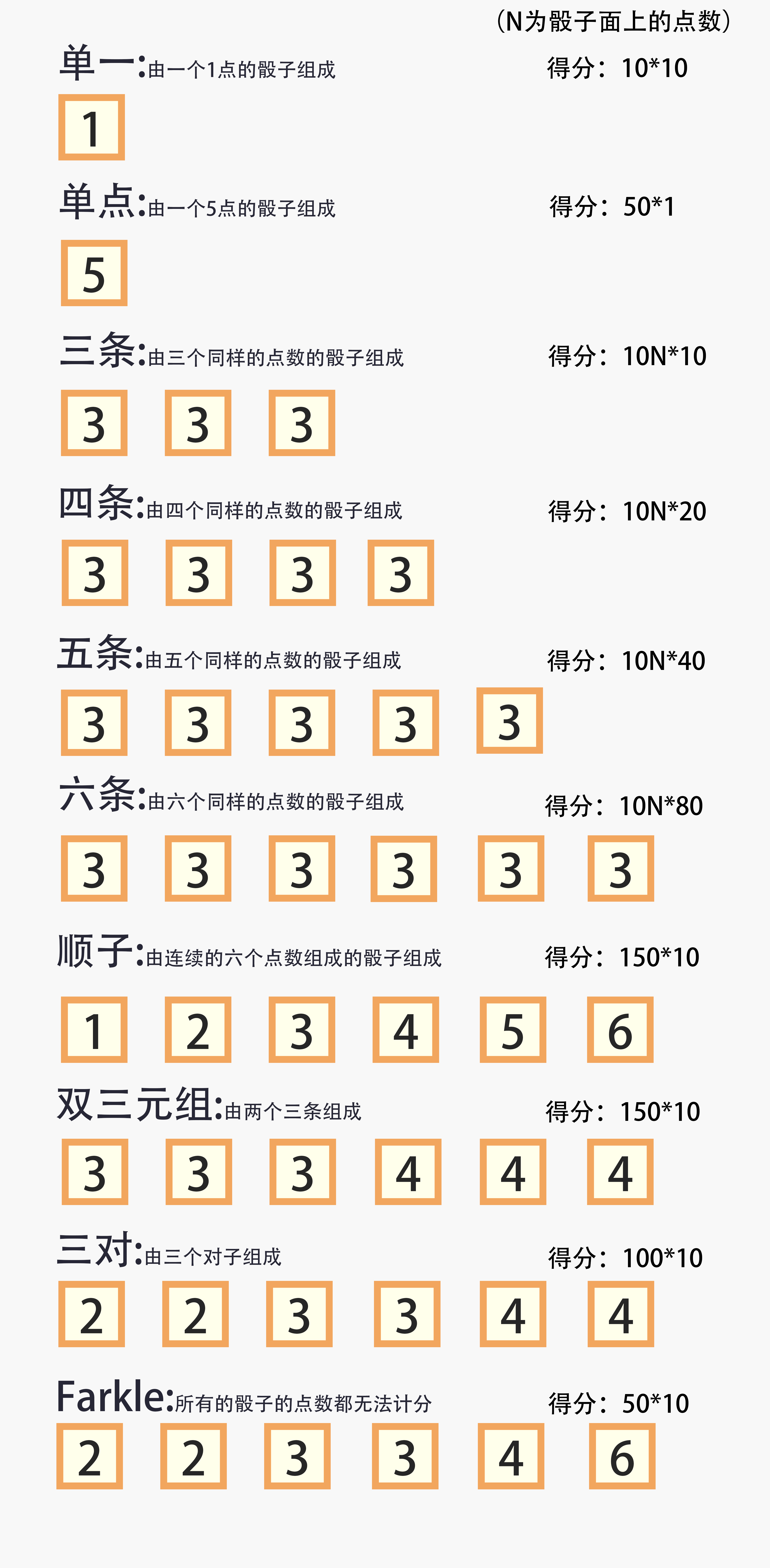 和farkle的规则一样,每次投掷都需要保留一个或一组有积分的骰子,如果在保留后出现不含积分的情况,就会爆掉,清空保留的积分。